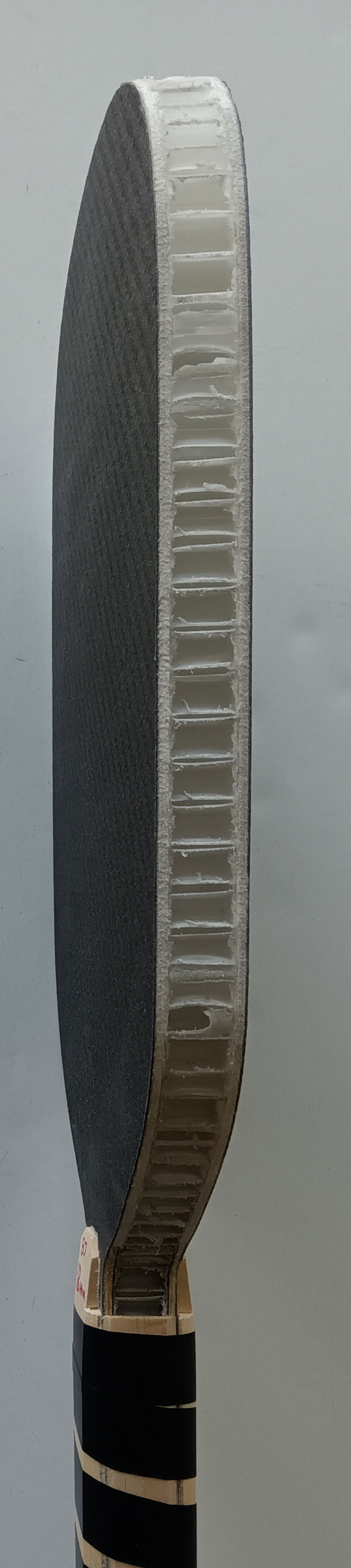 Carbon Fiber Weight: 8.5 ounces Grip Circumference: 4 1/4" Paddle Length: 16 1/4” Paddle Width: 7 3/8” Handle Length: 5 1/2” Paddle Face: 2 x 2 Twill Weave 3k/220g Carbon Fiber/textured, Fiberglass Core Materials: 1/2" polypropylene honeycomb, EVA foam Core Thickness: 18 mm Edge Guard Type: U-shape (1/8" overlapping paddle face)/ Arcade Express, Spain Grip Style: Tennis octagonal/ balsa & basswood pallets Handcrafted in the USA