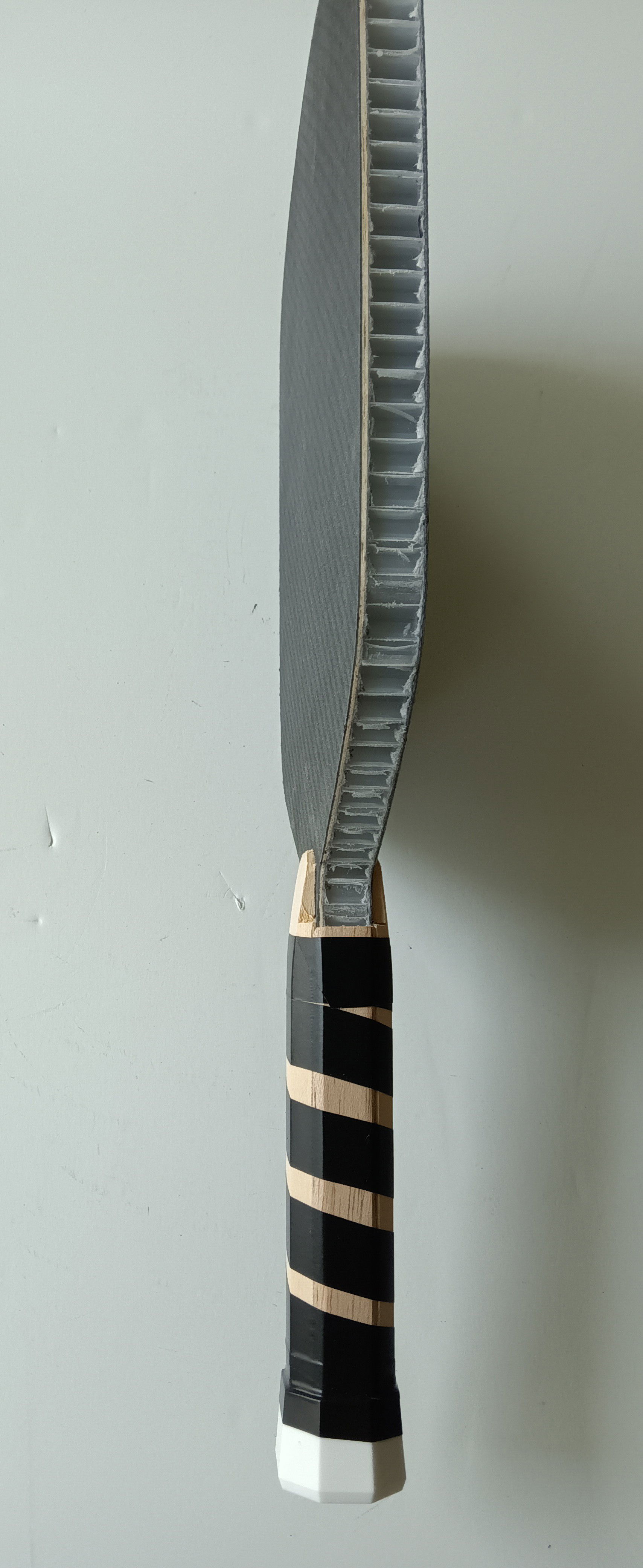 Carbon Fiber Weight: 8.3 ounces Grip Circumference: 4 3/16" Paddle Length: 16 1/2” Paddle Width: 7 1/2” Handle Length: 6” Paddle Face: 2 x 2 Twill Weave 3k/220g Carbon Fiber, fiberglass Core Materials: 1/2" Polypropylene honeycomb, 1.5mm balsawood Core Thickness: 15.75 mm Edge Guard Type: U-shape (1/8" overlapping paddle face)/ Arcade Express, Spain Grip Style: Tennis octagonal/ balsa & basswood pallets Handcrafted in the USA