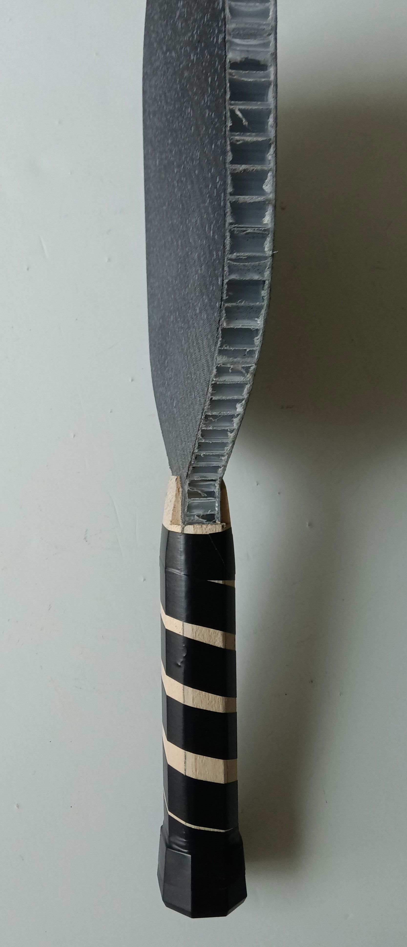 Carbon Fiber Weight: 8.8 ounces Grip Circumference: 4 1/4" Paddle Length: 15 7/8” Paddle Width: 7 3/4” Handle Length: 5 3/4” Paddle Face: 2 x 2 Twill Weave 3k/220g Carbon Fiber, fiberglass Core Materials: Raw 1/2" Polypropylene honeycomb Core Thickness: 14.8 mm Edge Guard Type: U-shape (1/8" overlapping paddle face)/ Arcade Express, Spain Grip Style: Tennis octagonal/ balsa & basswood pallets Handcrafted in the USA